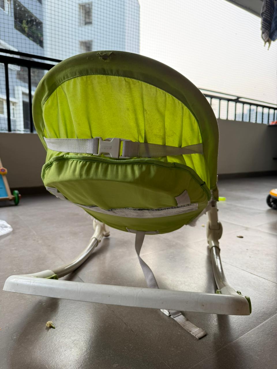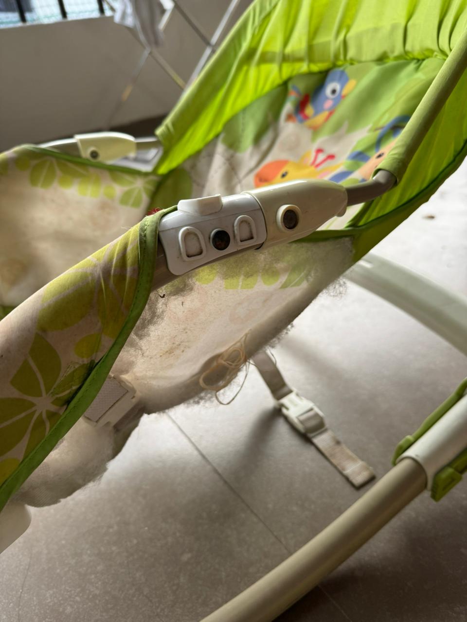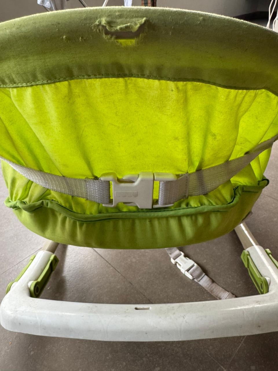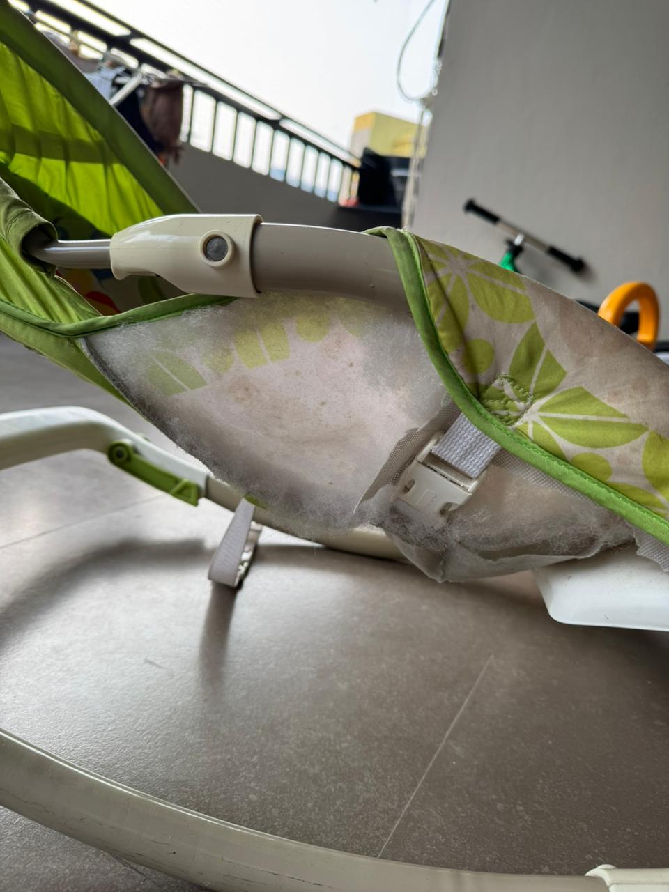 Although it is in used condition, the rocker remains fully functional. The toy bar is missing, and there is a small tear at the back, but neither affects its usability or comfort. The seat still provides good support, and the overall structure is sturdy and dependable.