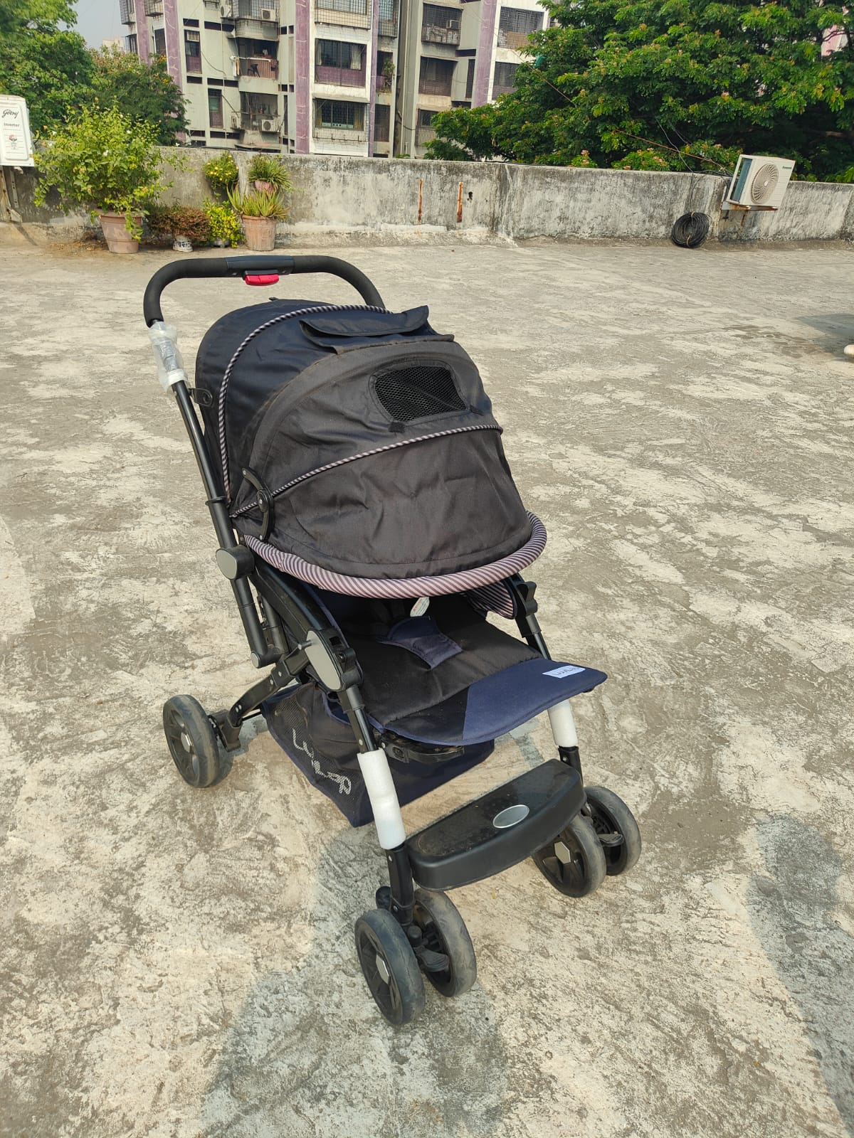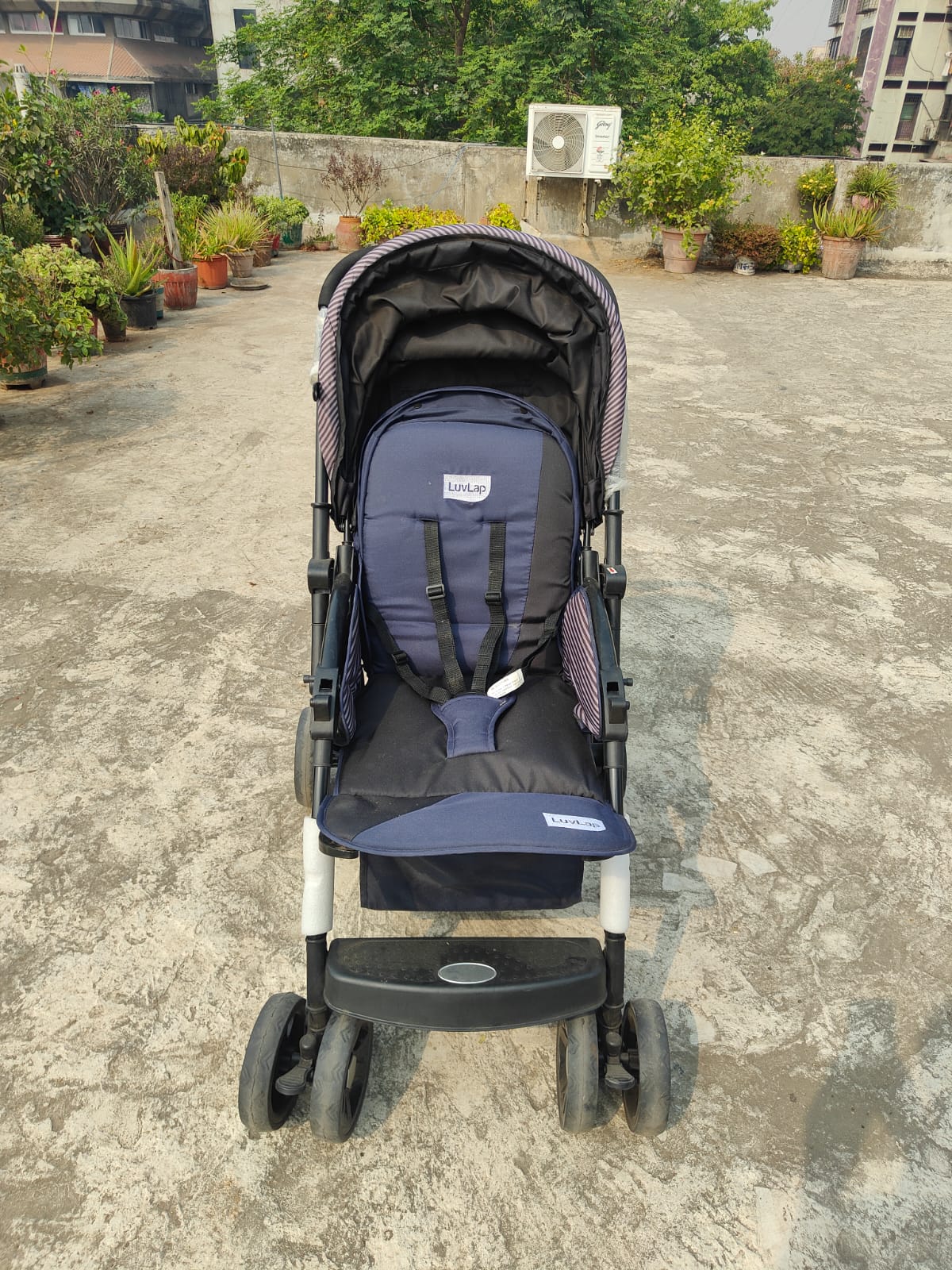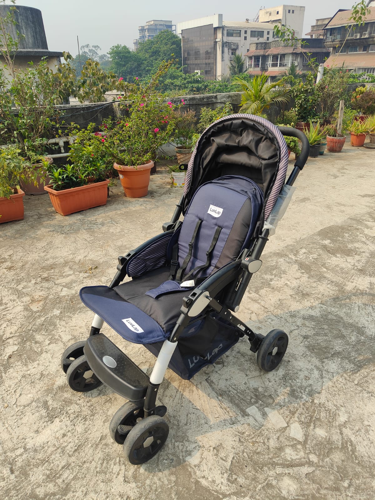 LuvLap Stroller (Blue) – A safe, comfortable, and easy-to-use stroller perfect for babies up to 2 years. This preloved, gently used stroller features a 5-point safety harness, multi-position reclining seat, and swivel front wheels with lock for smooth and secure rides. Its foldable canopy offers protection from the sun, while the lightweight build ensures easy maneuverability for parents. Ready for everyday strolls and adventures with your little one! 👶🛒✨