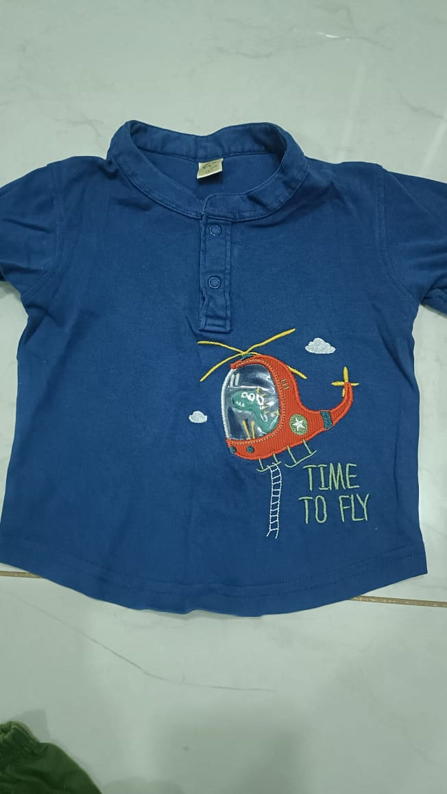 This Pre-Owned Baby Boy Outfit Set is a comfy and cute pick for babies aged 9–12 months. The bright blue T-shirt features a cheerful helicopter graphic with “Time to Fly,” adding a playful vibe to your child’s wardrobe. Paired with soft, olive green shorts that come with a flexible elastic waistband, this set ensures both comfort and ease of movement.