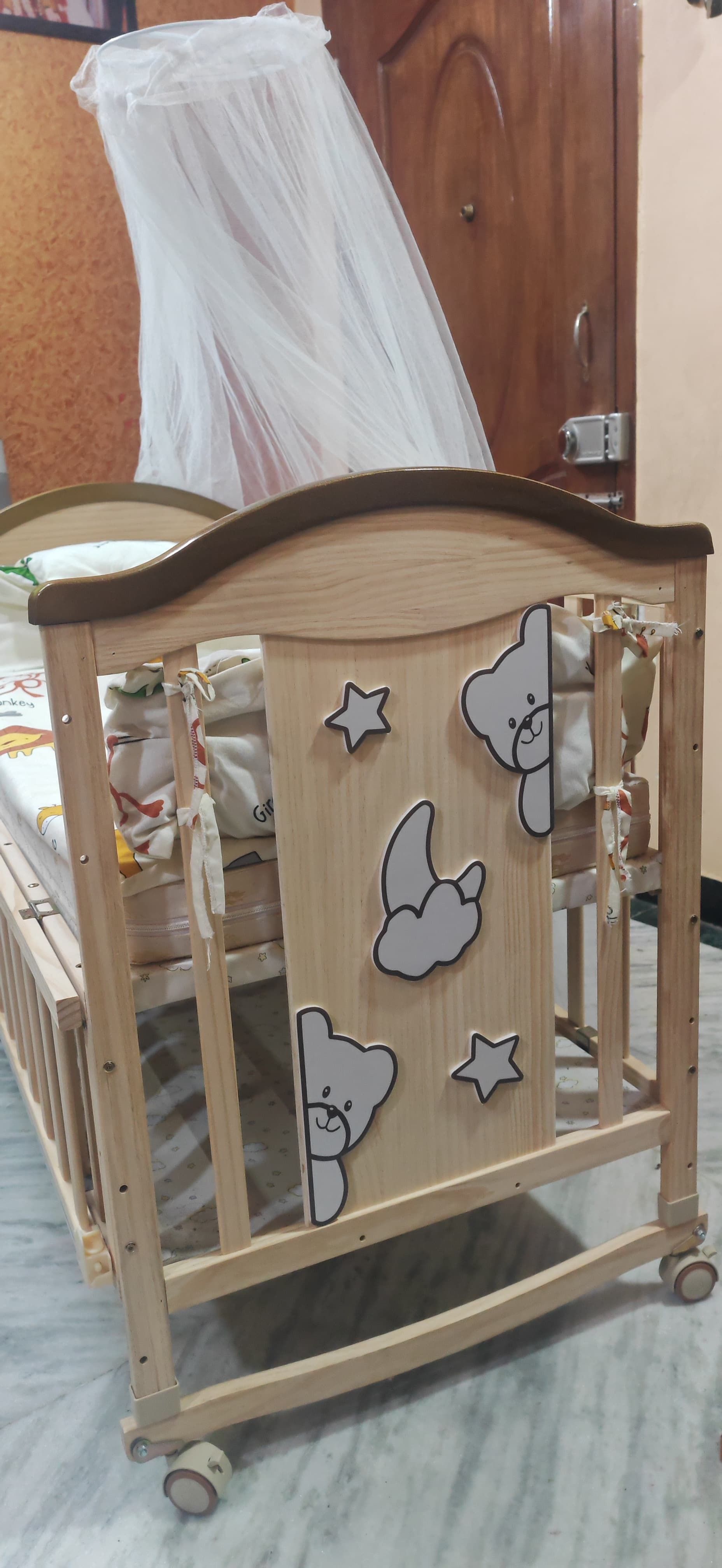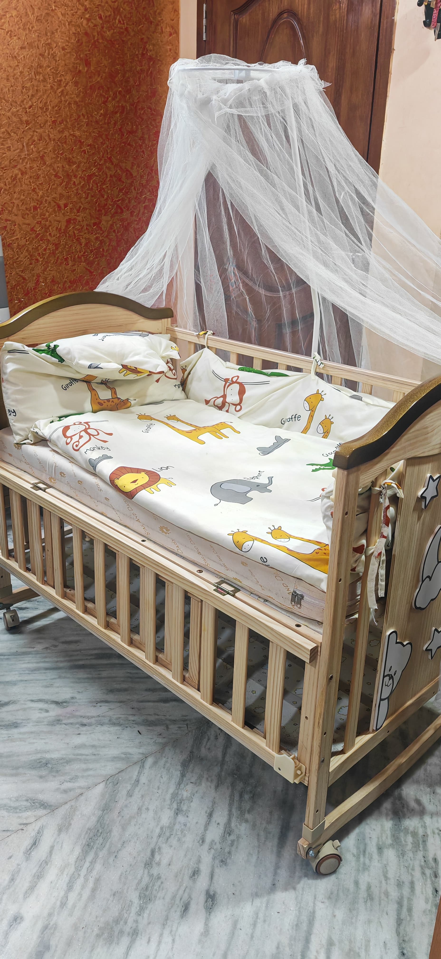 Perfect for apartments and indoor setups, the cot’s smooth-gliding wheels allow you to shift the baby from room to room with ease. The protective mosquito net ensures peaceful sleep—especially important in humid climates. It’s sturdy, versatile, and space-efficient, making it a smart buy for modern parents.